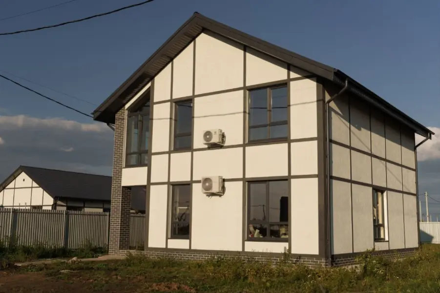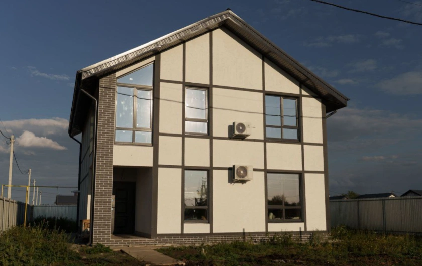 Дом выполнен из керамзито-бетонных блоков, которые имеют утеплитель в виде пенополистерола толщиной 10 см, для сохранения тепла внутри дома. Фундамент выполнен в виде ростверка на железобетонных забивных сваях, а окна в доме выполнены из профиля Rehau, что гарантирует высокое качество и долговечность.